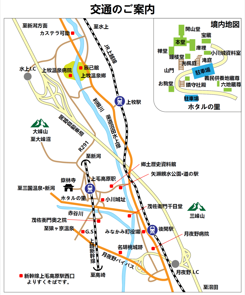 ●上越新幹線:東京駅より上毛高原駅まで約70分、上毛高原駅西口より徒歩8分●関越自動車道:練馬ICより月夜野ICまで約80分、月夜野ICより約10分