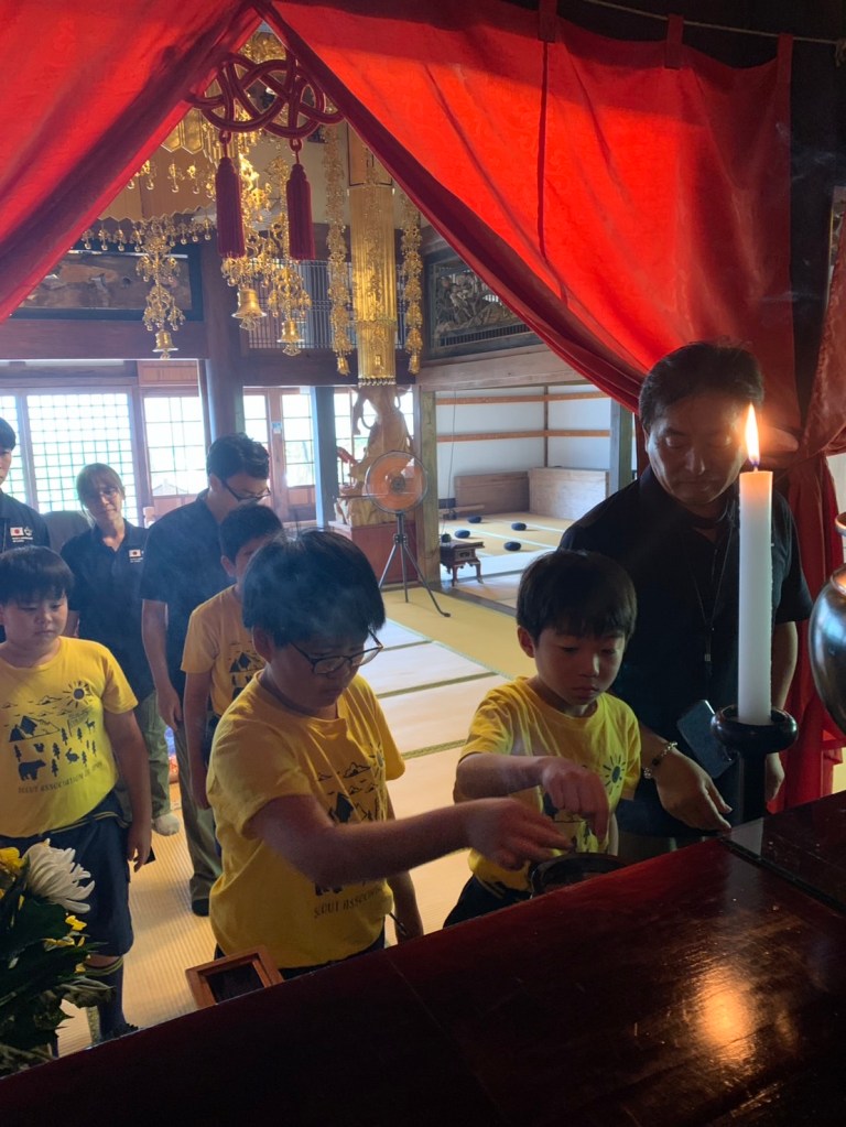 嶽林寺での禅問答にチャレンジしたスカウトはどんな問答がはじまるのか緊張感がMaxの状態でしたが、大役を終えてホッとしたようです。また、座禅で無になるのが難しかった、地獄絵図を見てびっくりしたなどの意見がありました。保護者もこのような体験は初めてとのことで、とても貴重な体験だったとのことでした」