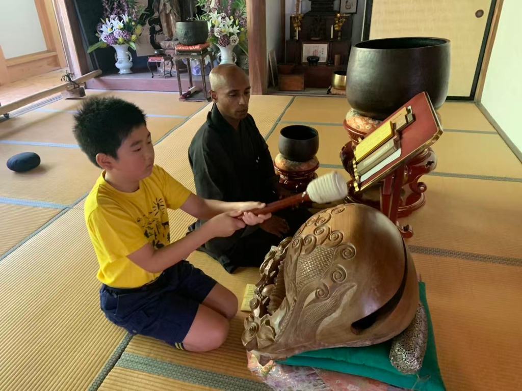 玄関入口の木板が三打打ち鳴らされ当山の弟子チヤミンダ龍静師が対応。